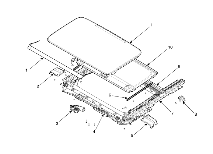 | 1. Deflector 2. Front frame bracket [RH] 3. Motor assembly 4. Sunroof frame assembly 5. Front frame bracket [LH] 6. Mechanism cover | 7. Mechanism 8. Rear frame bracket 9. Drain channel 10. Sunshade paner assembly 11. Glass panel assembly |