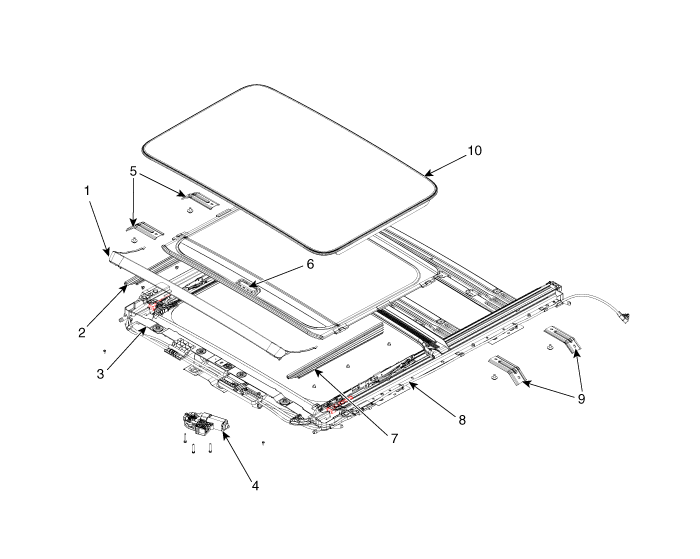 | 1. Deflector 2. Mechanism cover [RH] 3. Sunroof frame assembly 4. Motor assembly 5. Frame bracket [RH] | 6. Sunshade 7. Mechanism cover [LH] 8. Mechanism 9. Frame bracket [LH] 10. Glass panel assembly |