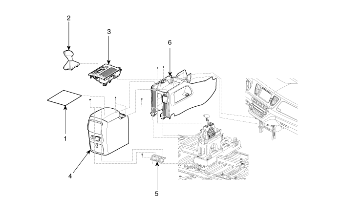 | 1. Console armrest met 2. Shift lever boots assembly 3. Console upper cover | 4. Rear console assembly 5. Floor console rear mounting bracket 6. Front console assembly |