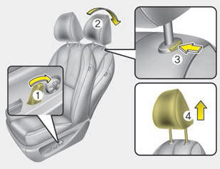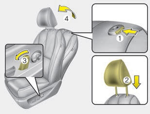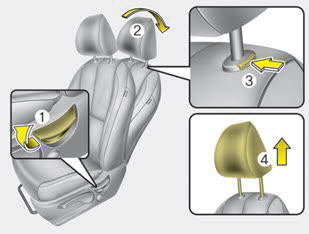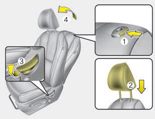 3. Press the headrest release button (3) while pulling the headrest up (4).